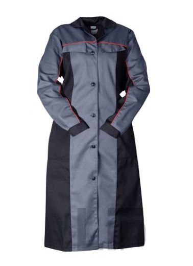 Халат на кокетке с центральной застежкой на пуговицах. По линии кокетки и рукавам кант. Накладные карманы входят в рельефные швы. Рукав длинный на манжете.