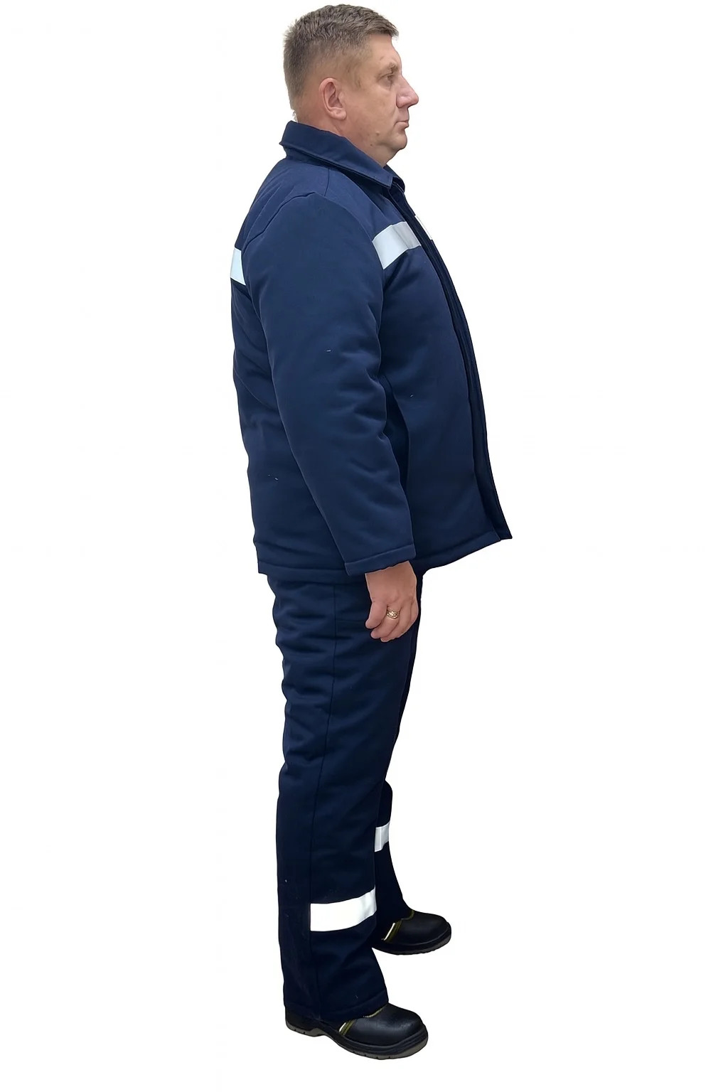 Брюки прямого силуэта с застёжкой – гульфиком спереди. Пояс передней и задней половинок цельнокройный с пятью шлёвками. На правой передней половинке брюк накладной карман. На передних половинках усилительные накладки из основного материала, переходящие на задние половинки. По линии груди и на спинке куртки, на передних и задних половинках брюк, ниже колена, располагается светоотражающая полоса. Утеплитель притачной.
