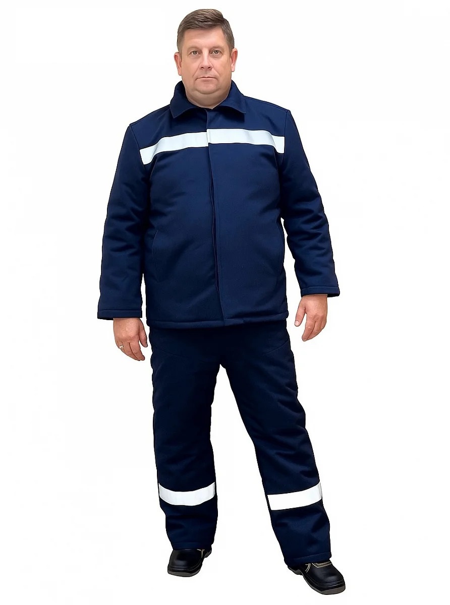 Брюки прямого силуэта с застёжкой – гульфиком спереди. Пояс передней и задней половинок цельнокройный с пятью шлёвками. На правой передней половинке брюк накладной карман. На передних половинках усилительные накладки из основного материала, переходящие на задние половинки. По линии груди и на спинке куртки, на передних и задних половинках брюк, ниже колена, располагается светоотражающая полоса. Утеплитель притачной.