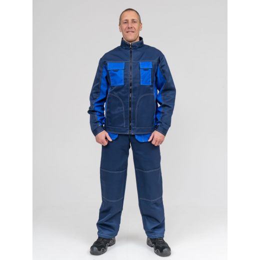 Двухцветный костюм из смесовой ткани. Куртка, полукомбинезон. Куртка укороченная с поясом, с воротником-стойкой, с застёжкой на молнию, с нагрудными и нижними карманами. Полукомбинезон с застёжкой на молнию, главная особенность костюма - это многофункциональные карманы на полукомбинезоне с множественными отсеками для различных инструментов (при активной работе или сгибании колен из карманов не выпадет содержимое). На задней части полукомбинезона два кармана и боковой карман для инструментов.