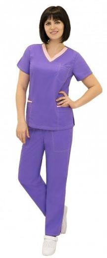Костюм женский медицинский, состоящий и куртки и брюк. Куртка полуприлегающего силуэта длиной до бедер, с разрезами в боковых швах. Горловина V-образная с притачной планкой из отделочной ткани. Перед имеет три накладных кармана фигурной формы. Рукав втачной, короткий. Планки нижних карманов выполнены из отделочной ткани. Брюки женские чуть зауженные к низу из основной ткани. Брюки имеют пять накладных кармана разной формы, один из них с отделением для ручки. Верхний срез брюк обработан притачным поясом и эластичной тесьмой и шнурком из репсовой ленты для комфортной посадки на талии. В боковых швах расположены разрезы