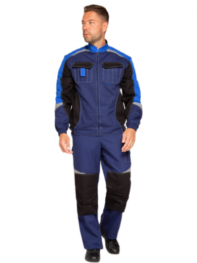 Укороченная куртка с застёжкой на молнию и воротником "стойка". Кокетки переда, спинки двухслойные и простеганы. Нагрудные накладные многофункциональные карманы с фигурными клапанами на липучку. Нижние внутренние карманы с застежкой на молнию под листочкой. Низ куртки по боковым сторонам с хлястиками для регулировки прилегания. Рукава резные комбинированные, низ регулируется хлястиком на липучку. Полукомбинезон с застежками: гульфик на молнию, левая боковая на пуговицы. На грудке многофункциональный карман с клапаном на липучку. На левом боковом шве накладной функциональный карман с клапаном на липучку. Задние половинки с накладным карманом и карманами для инструментов. По спинке резинка для лучшего прилегания. Полукомбинезон с бретелями, длина регулируется резинкой и застежкой-фастексом. По шаговым швам усилительные фигурные накладки.