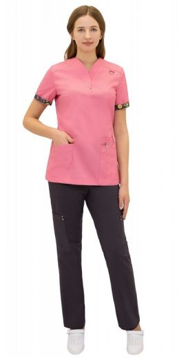 Костюм женский медицинский состоит блузки и брюк из ткани класса люкс Блузка из основной ткани полуприлегающего силуэта длиной чуть ниже уровня бедер, с фигурной линией горловины и 4 накладными карманами разной конфигурации. Крой блузы позволяет обходиться без застежки. Брюки - прямые, универсальные, зауженного кроя, в стиле кэжуал. Они имеют традиционную застежку в виде молнии и пуговицы, а также шлевки на поясе. Данная модель брюк оснащена множеством карманов: 2 косых в боковых швах на бедрах, два накладных кармана на боковых швах выше колена.