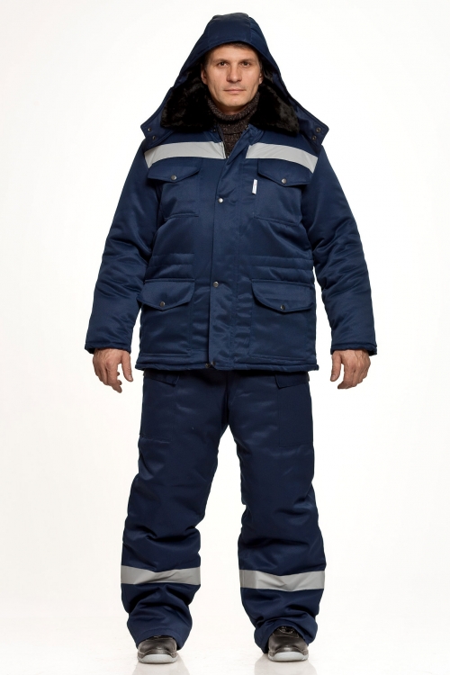Костюм состоит из куртки и брюк. Куртка со световозвращающими полосами, с центральной бортовой застежкой на молнию, с ветрозащитным клапаном на кнопках. Вместительные утепленные нагрудные и боковые карманы защищены клапанами на кнопках. Рукав прямой с трикотажной манжетой. Куртка с меховым воротником и съемным капюшоном на кнопках. Объем талии регулируется кулисой со шнуром. Брюки. По низу проходит широкая световозвращающая полоса.  Ткань смесовая, 35/65, плотность 210 г/кв.м, ВО, синтепон куртка 360 г/кв.м п/к 240 г/кв. м,